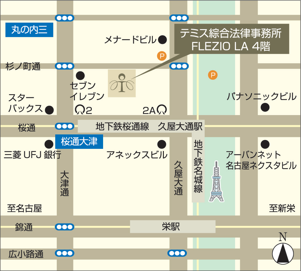 久屋大通を北上し、「桜通久屋西」交差点の2つ北の交差点(「魚ノ棚通」と「久屋大通」の交差点)を左折、次の交差点を左折、次の交差点を再度左折